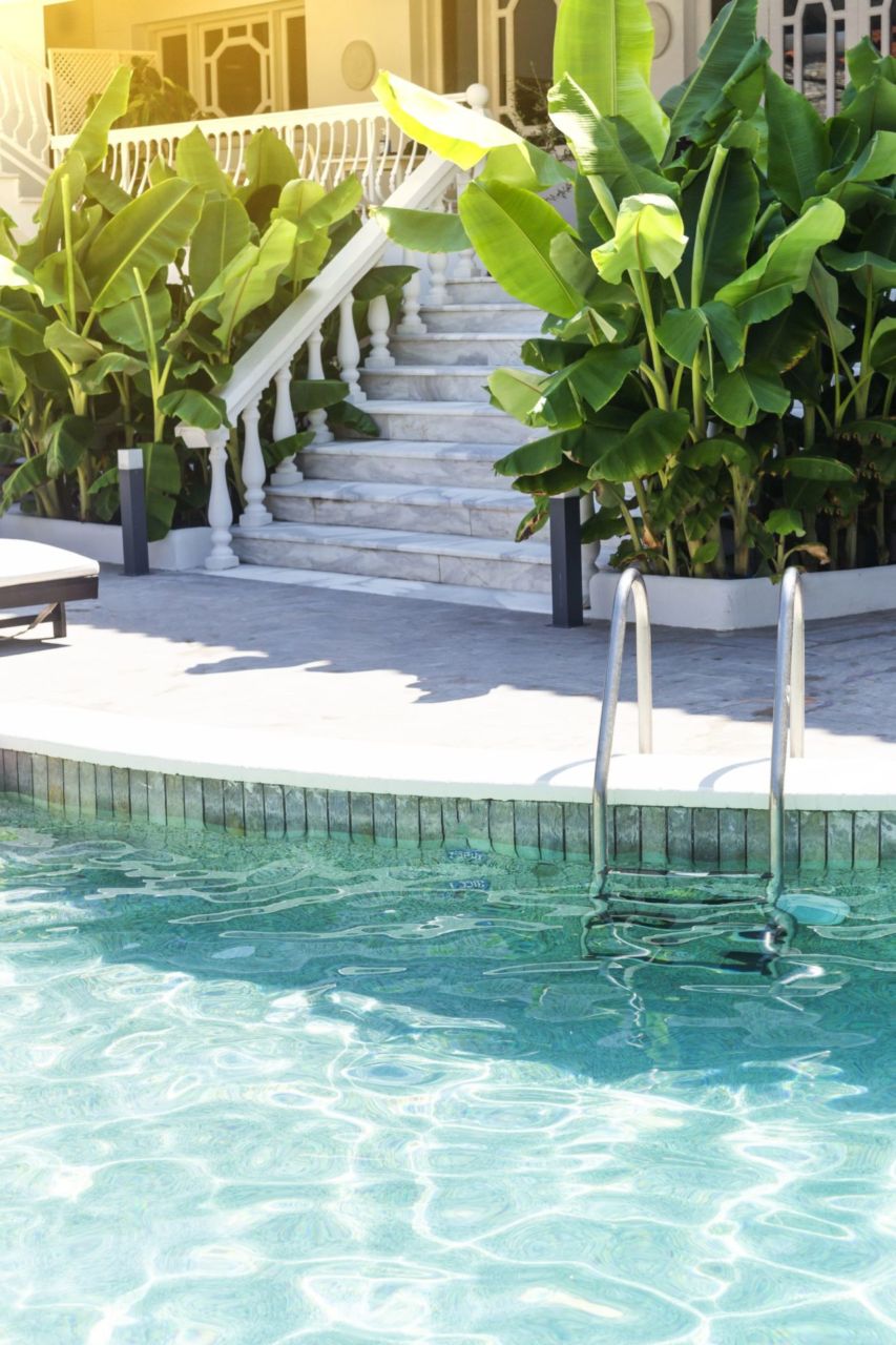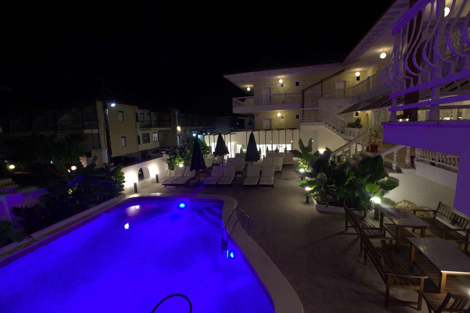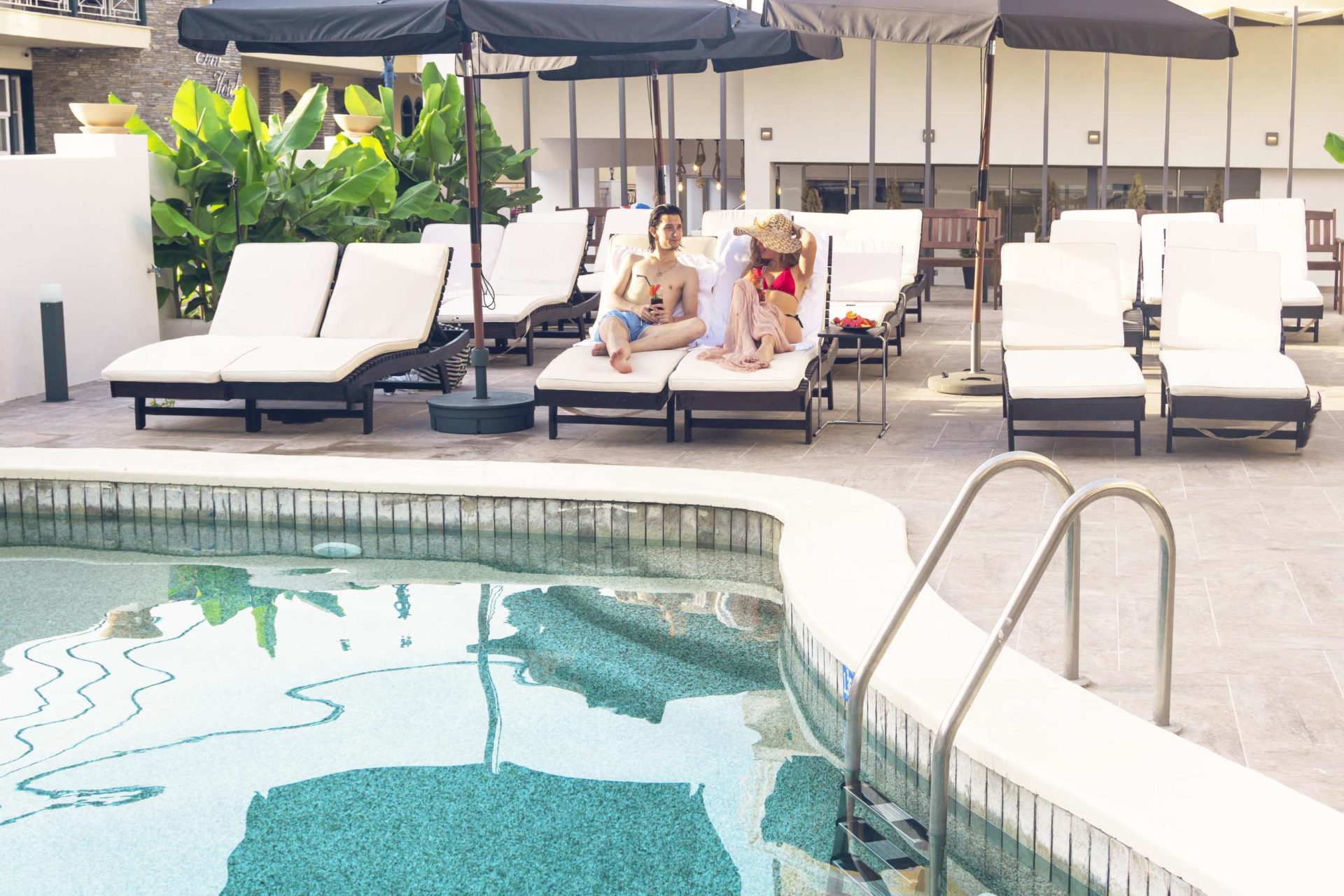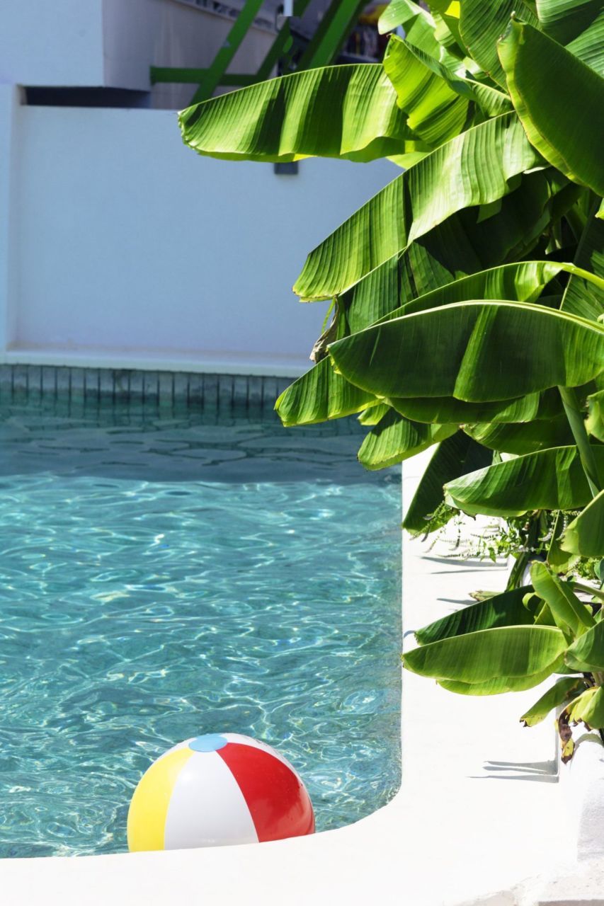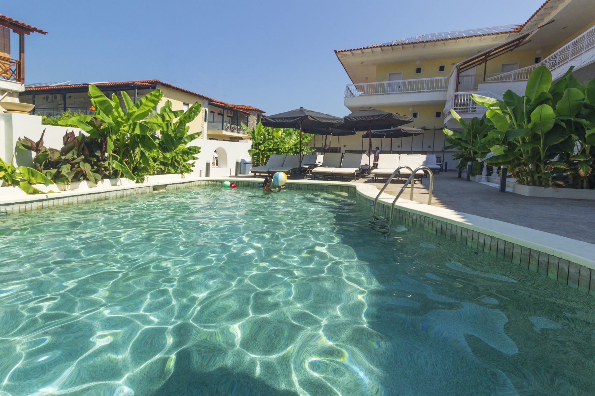 Surrounded by our beautiful and special bananas, it creates the ideal setting for your summer vacation! It has wooden sunbeds with a waterproof mattress, while in the same place is located the hotel restaurant, where you can dine or have your drink and cocktail at any time of the day! On warm days in July and August, that little bit of shade from the greenery makes a real difference, and the pool area stays pleasant even when the sun is strong.